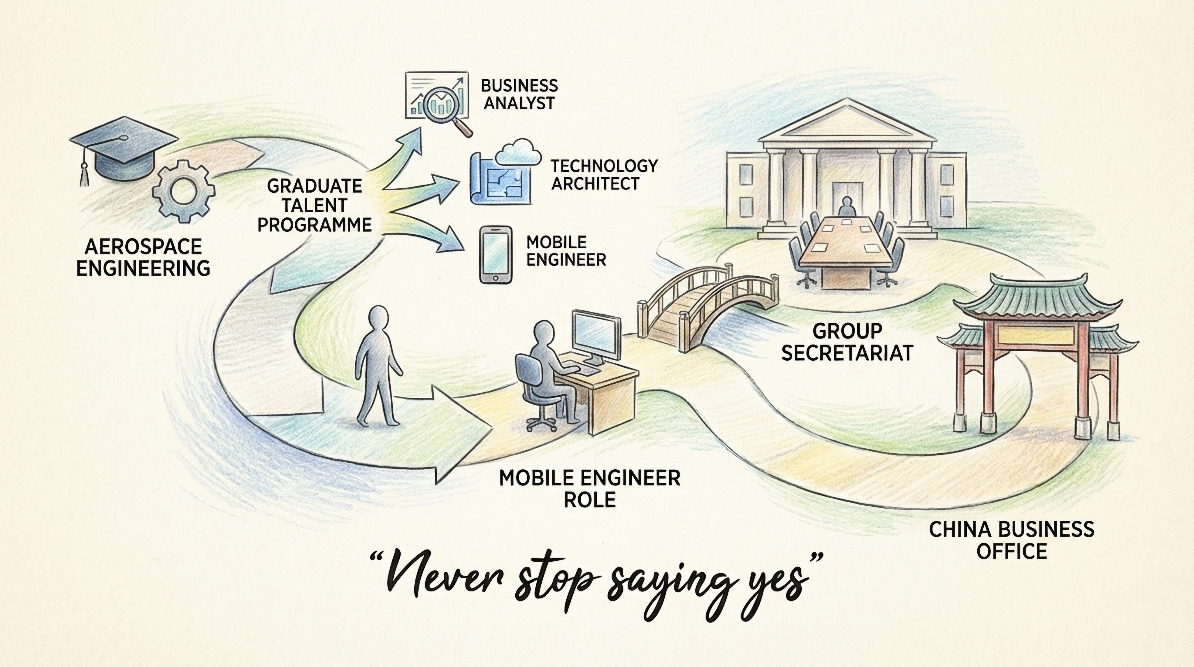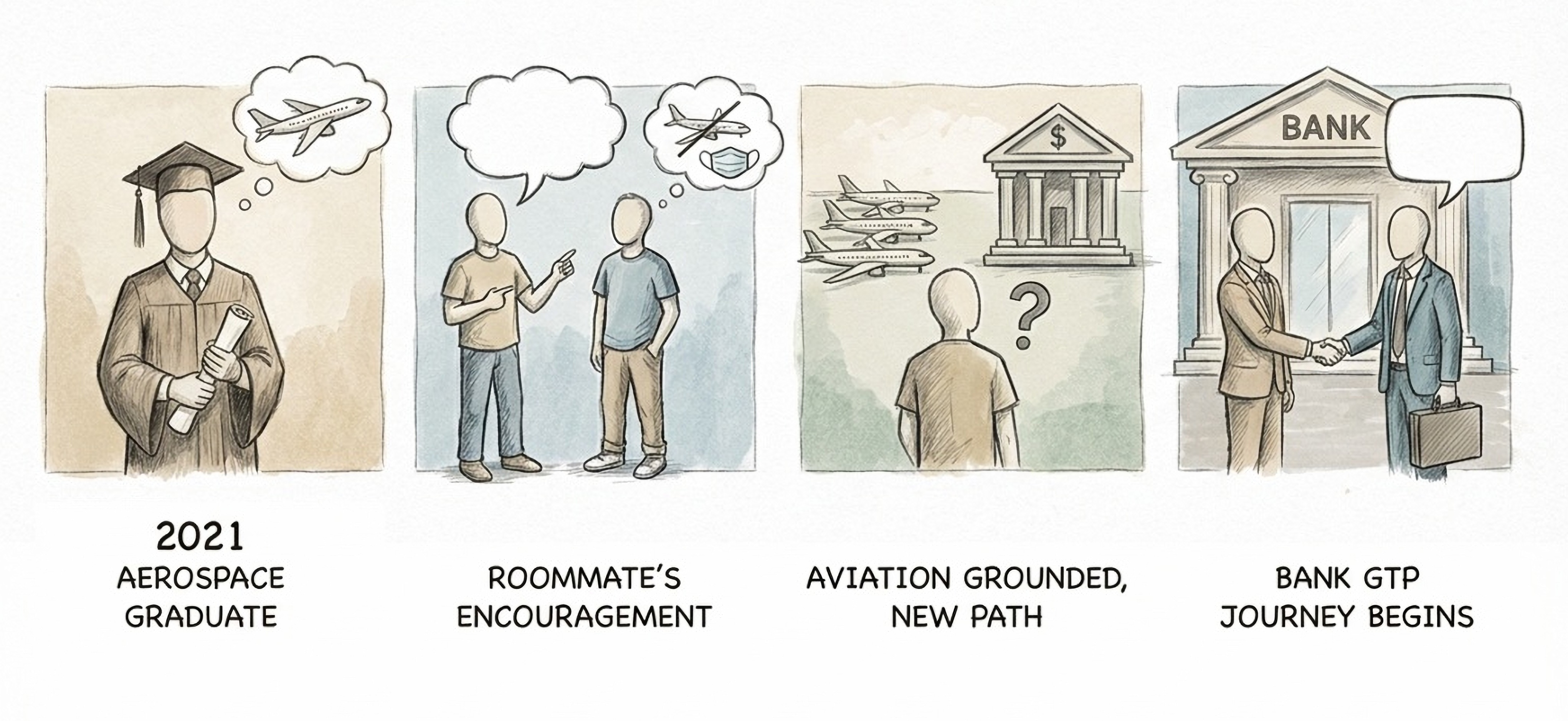我毕业于航空航天工程专业,但受新冠疫情影响,航空业一度停摆。在探索其他职业路径的过程中,我逐渐被银行业所提供的发展机会所吸引。