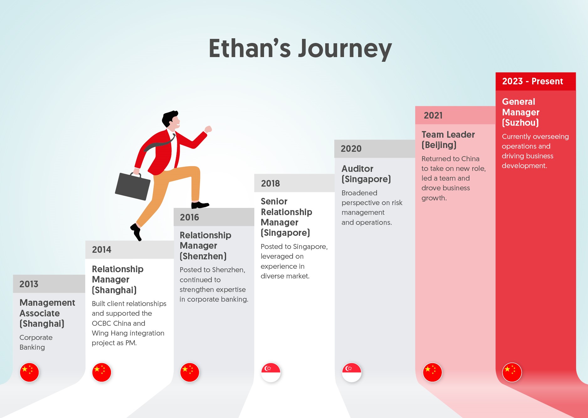 Five cities. Two countries. One remarkable career. Ethan’s bold moves across borders shaped him into a versatile leader with regional impact. Each experience built his global mindset and intercultural skills, paving the way to his role as Suzhou Branch Manager in OCBC China.